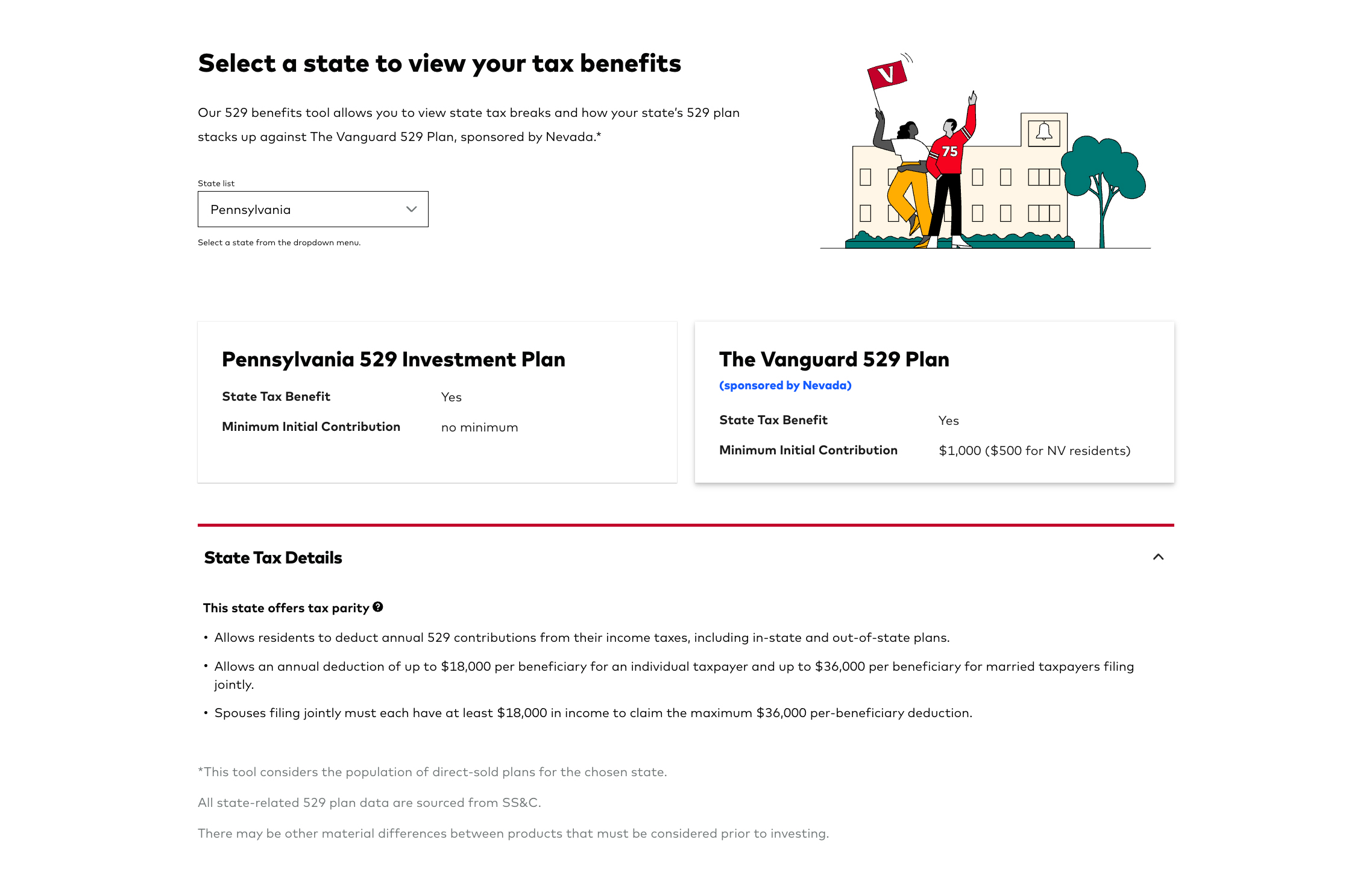 The page didn’t provide information about state tax benefits which would help clients determine if they should open the Vanguard 529 or go with their state’s plan.